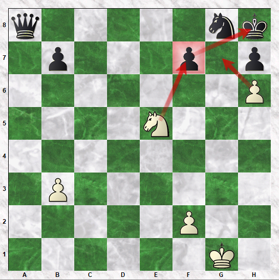 El caballo mueve a d-7 y amenaza con Jaque al Rey negro,